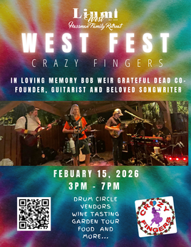 Celebrate community, music, and togetherness at Liumi West Hassman Family Retreat’s annual West Fest featuring Crazy Fingers (Grateful Dead cover band) Enjoy a vibrant afternoon filled with live music, a drum circle, local vendors, garden tours, great food, and fun for all ages.